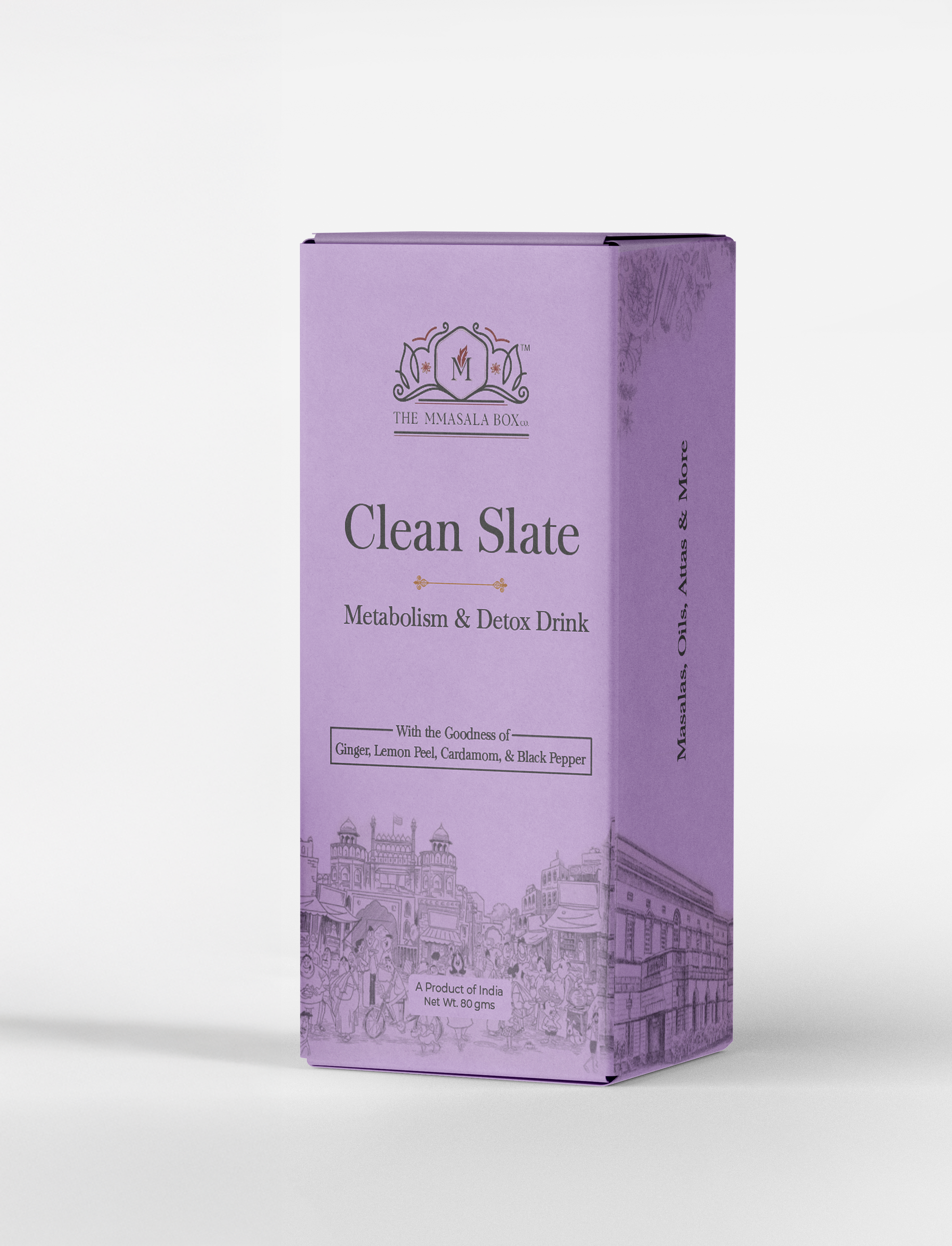 Clean Slate from The Mmasala Box is a detox and metabolism blend made with ginger, lemon peel, cardamom, cinnamon, and black pepper. A zesty, spice-forward tonic that refreshes, balances, and energises—perfect hot or cold to reset your day naturally.