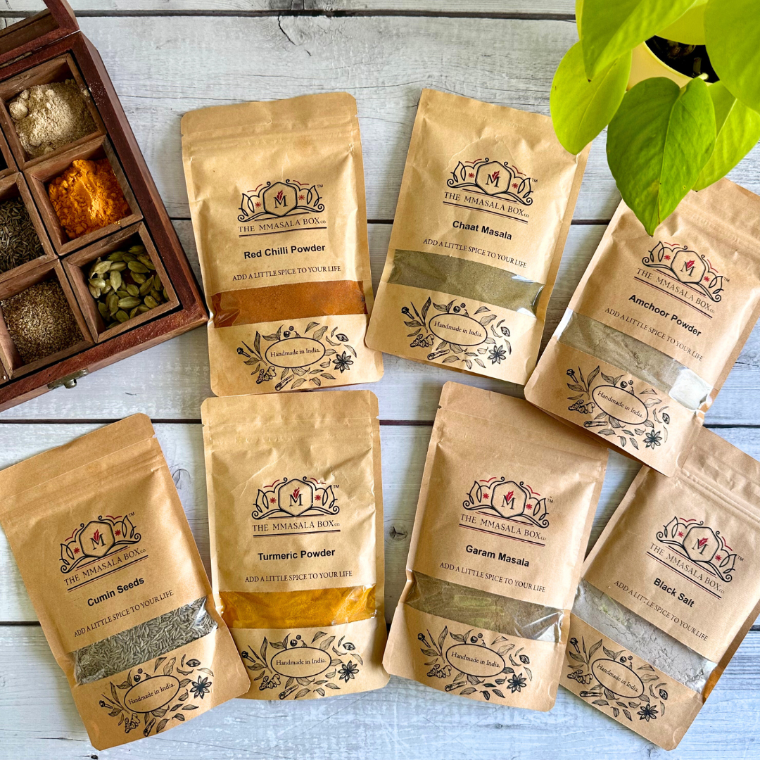 Experience the essence of India's diverse flavors with MMasala Box's Daily Mix Combo. This curated selection includes Turmeric, Black Salt, Dry Mango, Cumin, Garam Masala, Chaat Masala, and Red Chilli Powder. Each spice adds depth to dishes, celebrating the rich tapestry of Indian cuisine in every meal.