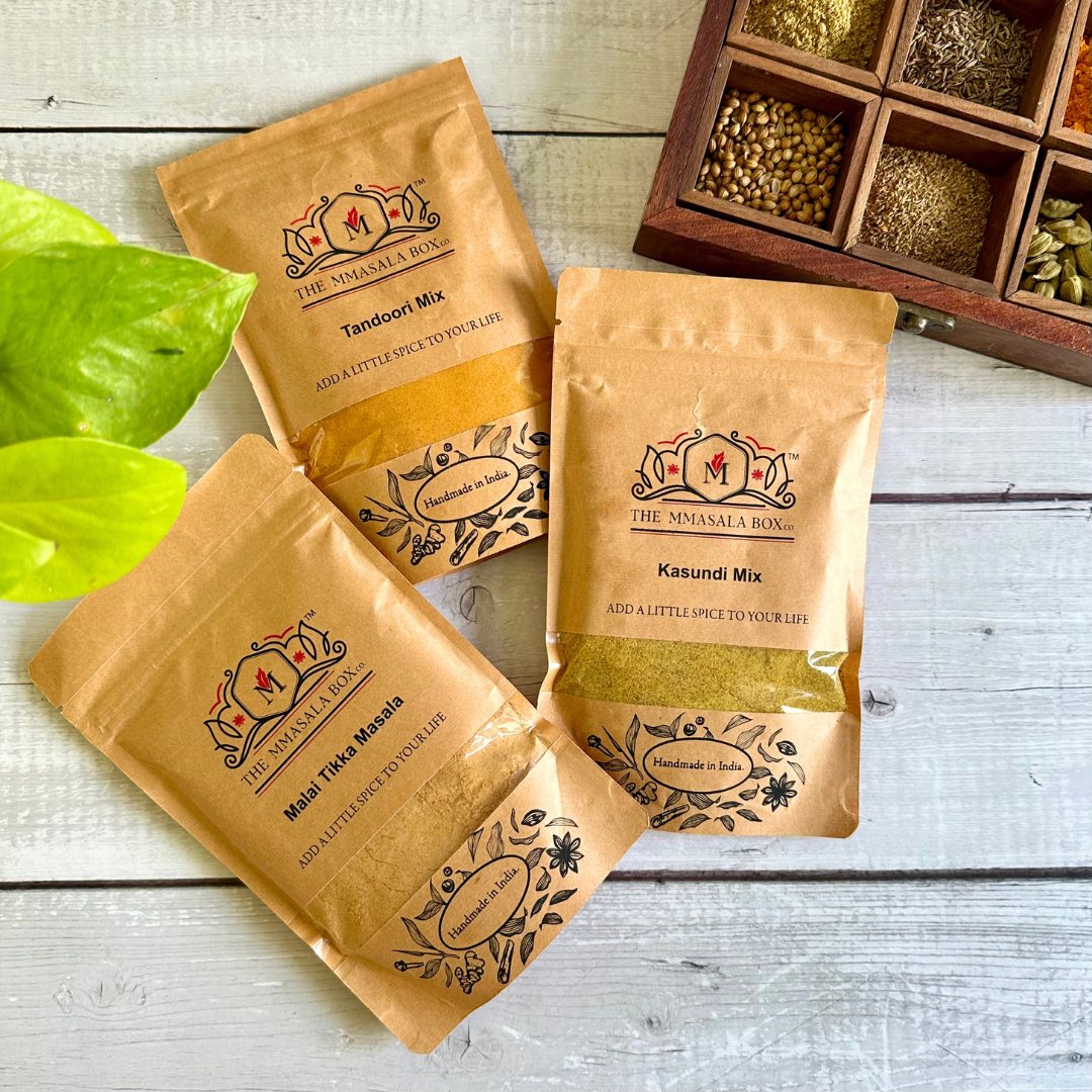 Spice up your BBQ with MMasala Box Co.'s Grill Mix. Packed with aromatic spices like ginger, garlic, and Kashmiri Deghi Mirch, it's perfect for delicious Tandoori dishes or zesty Kasundi flavors. Add a taste of authentic Indian grilling to your backyard cookouts effortlessly!