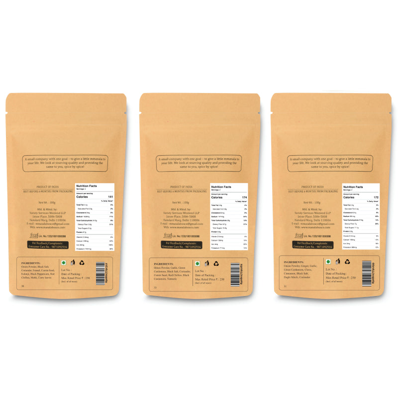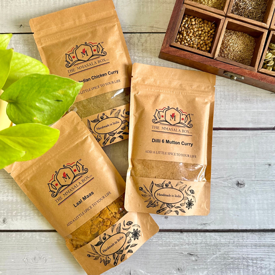MMasala Box Co. Meat Masala Combo is a spice mix typically used as a marinade or curries for various types of meat. It comes in a special combination of spices that adds a lovely aroma and strong flavour to all your non-veg recipes. It can also be used in veg dishes such as veggies, paneer, baby corn, mushroom etc.